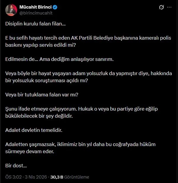 Mücahit Birinci, paylaşımında isim vermeden Nuri Güler olayına atıfta bulunarak, AK Partili bir belediye başkanının özel hayatındaki "sepih" tercihlerine rağmen sürecin sessiz sedasız sadece disiplin kuruluyla sınırlı kalmasını eleştirdi. Birinci, başka örneklerde görülen "kameralı polis baskınları" ve "hızlı servis edilen görüntüler" gibi uygulamaların bu olayda yaşanmadığına dikkat çekti. Hukukun partiye göre eğilip bükülemeyeceğini savunan Birinci, "Adalet devletin temelidir" diyerek usuldeki farklılıklara tepki gösterdi.