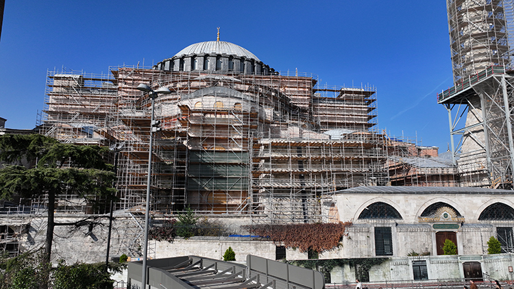 İş programında en hasarlı cephe olan kuzey cephe beden duvarlarından çalışmaya başlanıldı. Bir çalışma aksı oluşturularak ana kubbe ve yarım kubbelere iskele ve çalışma platformları ile bağlantılar tamamlandı. Bilim Kurulu kararı ile doğu cephe iskele çalışmaları da devam ediyor.