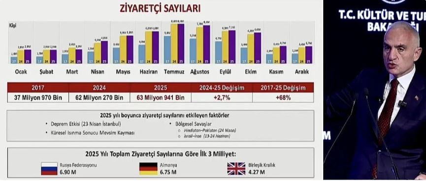 Ersoy, geçen yıl Türkiye'de 63 milyon 941 bin ziyaretçi geldiğini ve Türkiye'den çıkış yapan ziyaretçi sayısının 2025 yılında bir önceki yıla göre yüzde 2,7 arttığı açıkladı.
