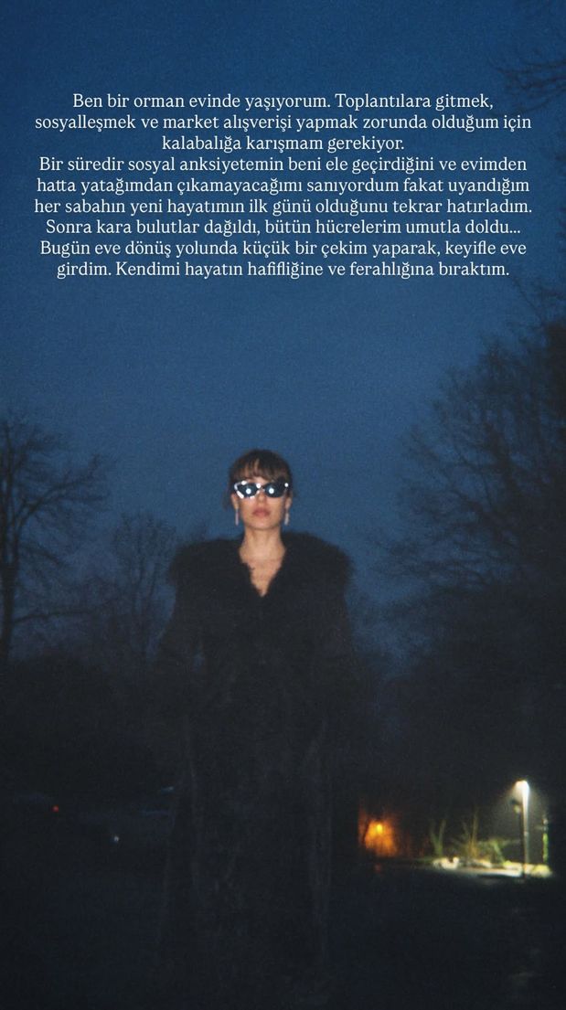 Oyuncu paylaşımında şu ifadelere yer verdi; "Ben bir orman evinde yaşıyorum. Toplantılara gitmek, sosyalleşmek ve market alışverişi yapmak zorunda olduğum için kalabalığa karışmam gerekiyor. Bir süredir sosyal anksiyetemin beni ele geçirdiğini ve evimden hatta yatağımdan çıkamayacağımı sanıyordum. Fakat uyandığım her sabahın, yeni hayatımın ilk günü olduğunu kendime tekrar hatırlattım. Sonra kara bulutlar dağıldı, bütün hücrelerim umutla doldu… Bugün eve dönüş yolunda küçük bir çekim yaparak keyifle eve girdim. Kendimi hayatın hafifliğine ve ferahlığına bıraktım."