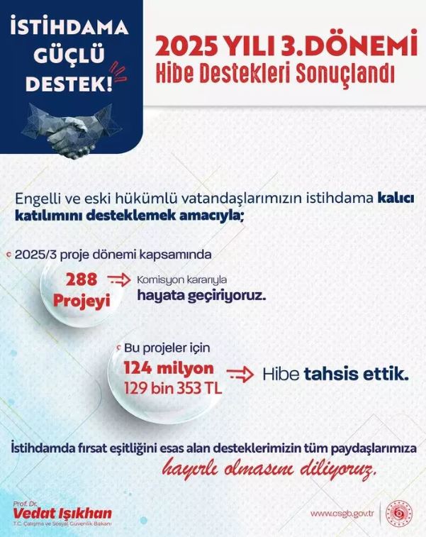 "Engelli ve eski hükümlü vatandaşlarımızın istihdamını artırmak için 2025 yılının 3. döneminde, 288 projeye destek olduk. Toplamda 124 milyon liradan fazla hibe desteği tahsis ettik. Çalışma hayatına, üretime katılmak isteyen vatandaşlarımıza destek İŞKUR'dan."