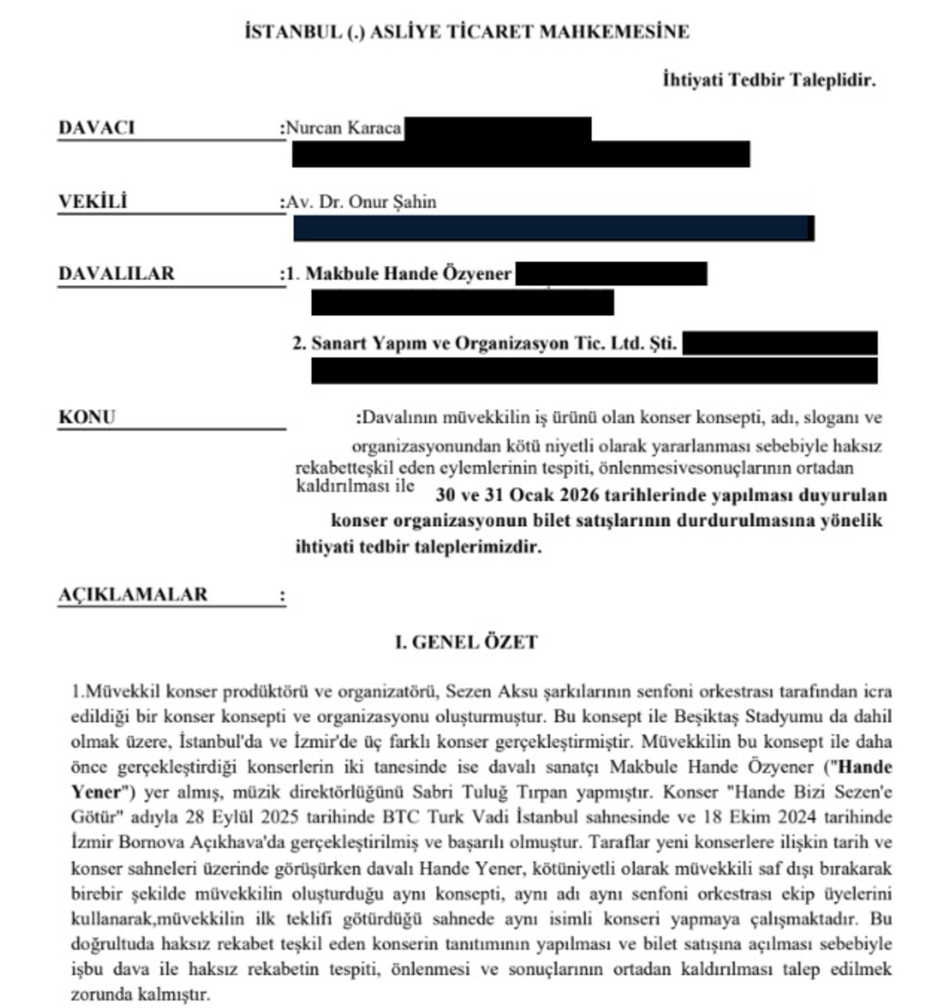 2024'te seyirciyle buluşturulan, tüm oluşum süreci ve fikri altyapısı Nurcan Karaca'ya (NK Projeler) ait olan "Hande Bizi Sezen'e Götür! Senfonik" projesinin, izin alınmaksızın aynı başlık ve konseptle bilet satışına açılması üzerine yorumcu Hande Yener ve bilete açan organizasyon firmasına dava açarak hukuki süreci başlatmış bulunuyoruz. Söz konusu proje; konsept geliştirme, senfonik aranjelerin en sağlıklı şekilde yapılması, senfoni orkestrası yapılanması, içerik kurgusu, başlık tasarımı, tanıtım teaser yapısı ve organizasyon modeli dâhil olmak üzere tüm yönleriyle özgün bir proje olarak NK Projeler tarafından geliştirilmiştir.