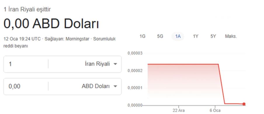 İran sokaklarını yangın yerine çeviren protestoları ateşleyen enflasyon akılalmaz boyutlara ulaştı. Google grafiklerine 1 İran Riyali, 0,00 dolar olarak görüldü. 1 ABD doları ise 1 milyon 137 bin 500 İran Riyali olarak aktarıldı.