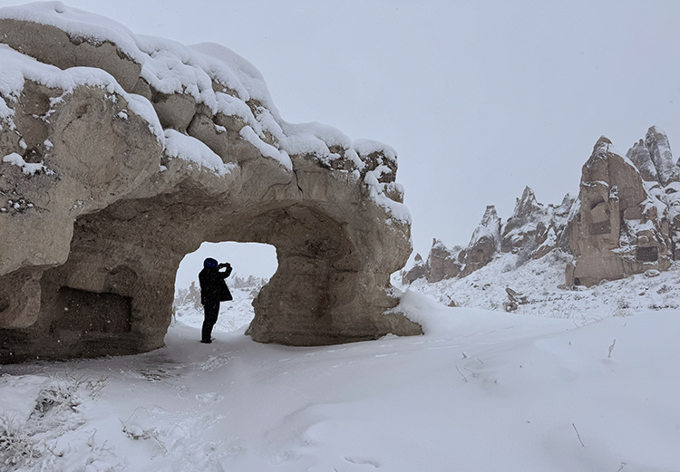 Bölgeyi gezen yerli ve yabancı turistler, kar altındaki peribacaları arasında gezinti yapıp, hatıra fotoğrafı çektirdi.