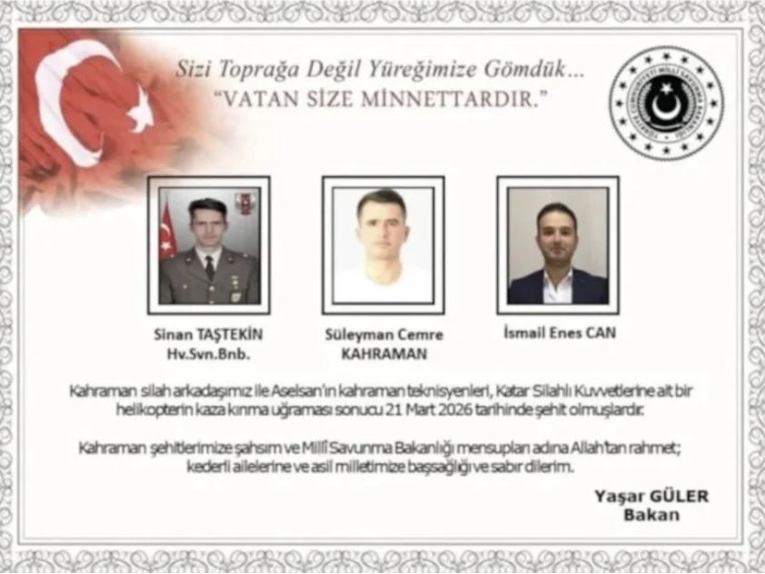 MSB, Katar’da görev yapan askeri helikopterin düşmesi sonucu 1’i Türk Silahlı Kuvvetleri personeli, 2’si ASELSAN çalışanı olmak üzere 7 kişinin şehit olduğunu açıkladı.