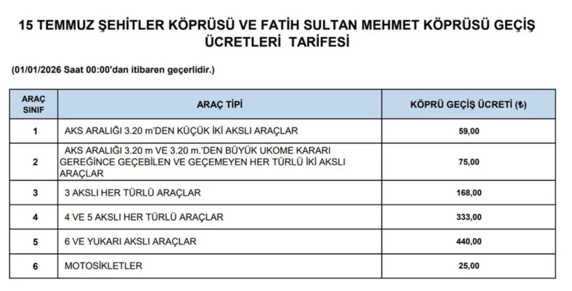 Karayolları Genel Müdürlüğünce ve Kamu Özel İşbirliği (KÖİ) ile özel şirketler tarafından işletilen yol ve köprülerin geçiş ücretleri 1 Ocak 2026 Perşembe günü sat 00.00'dan itibaren geçerli olacak şekilde zamlandı.