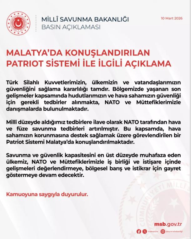 Milli Savunma Bakanlığı'ndan yapılan açıklamada, Malatya'da konuşlandırılan Patriot Sistemine ilişkin bilgi verildi.