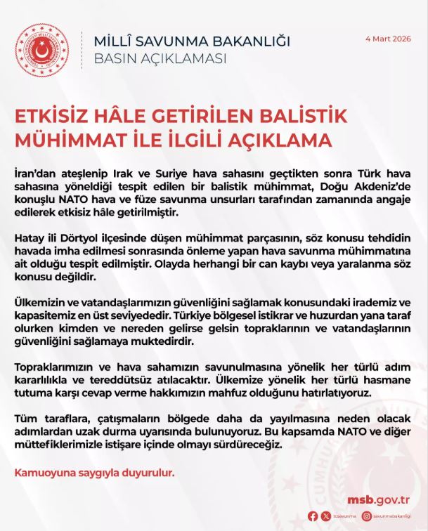 Milli Savunma Bakanlığı (MSB), İran'dan ateşlenip Irak ve Suriye hava sahasını geçtikten sonra Türk hava sahasına yöneldiği tespit edilen balistik mühimmatın Hatay'ın Dörtyol ilçesinde etkisiz hale getirildiğini açıkladı.