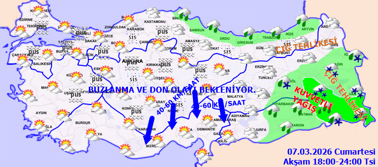 Yağışların, Doğu Anadolu'nun güneydoğusu ile Mardin, Batman ve Siirt çevrelerinde yer yer kuvvetli olması bekleniyor. Sabah ve gece saatlerinde Marmara, İç Ege, İç Anadolu ile Karadeniz'in iç kesimlerinde sis ve pus ile birlikte iç ve doğu bölgelerde buzlanma ve don olayının görüleceği tahmin ediliyor. Doğu Karadeniz’in iç kesimlerinin yüksekleri ile Doğu Anadolu’nun yüksek kar örtüsüne sahip eğimli kesimlerinde çığ tehlikesi ile kar erimesi tehlikesi bulunmaktadır.