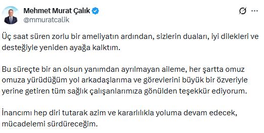 Ameliyat sonrası sosyal medya hesabından paylaşım yapan Çalık, şu ifadeleri kullandı: