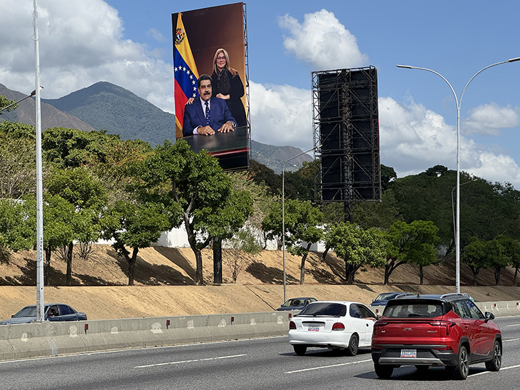 Maiquetia'daki Simon Bolivar Uluslararası Havalimanı'ndan başkent Caracas'a uzanan otoyol güzergahında sürücüler ve yolcular, dev panolara asılmış Maduro ve eşinin pek çok fotoğrafıyla karşılaşıyor.