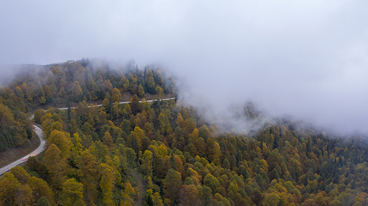 Yedigöller Milli Parkı yolu üzerinde bulunan Ayıkayası mevkisinde etkili olan sis dronla görüntülendi.